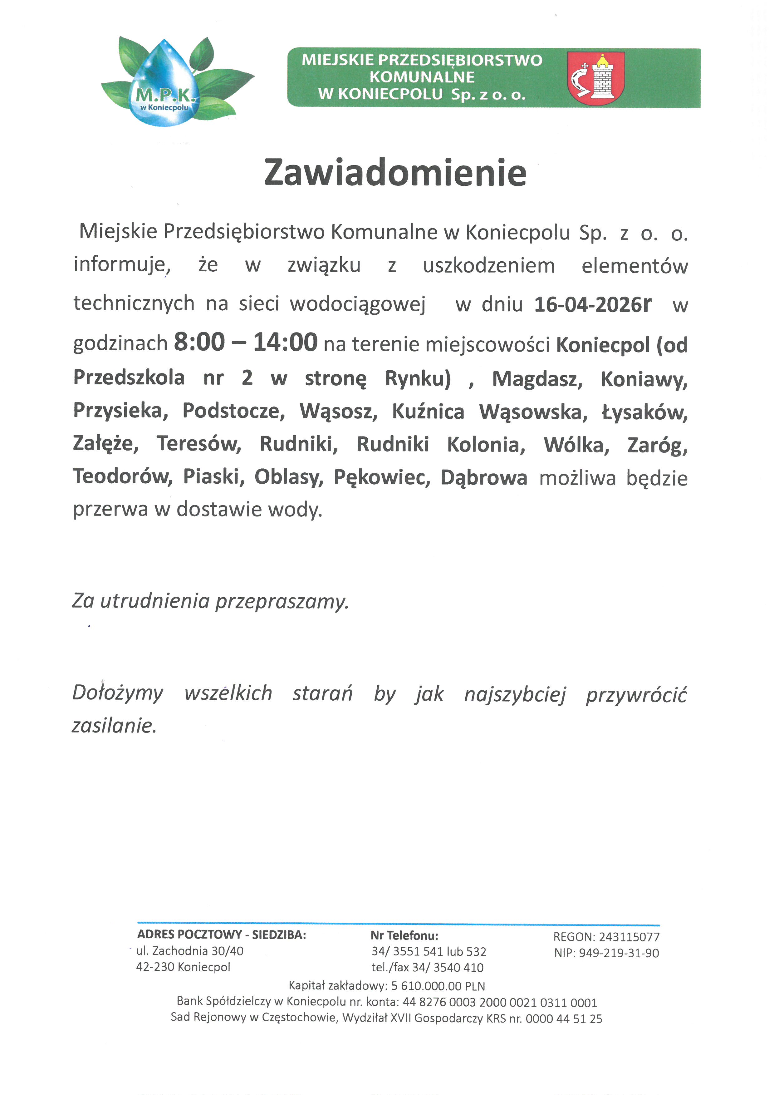 16.03.2026Miejskie Przedsiębiorstwo Komunalne w Koniecpolu Sp. z o. o. informuje, że w związku z przebudową i rozbudową układu drogowego wykonywaną przez firmę zewnętrzną oraz związaną z tym modernizacją sieci wodociągowej w dniu 17-03-2026 r. w godzinach od 8:00 do 15:00 na terenie miejscowości Koniecpol w obrębie ulic Willowej Wesołej, Bukowej, Brzozowej, Akacjowej, Topolowej możliwa będzie przerwa w dostawie wody.